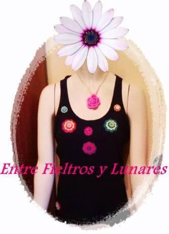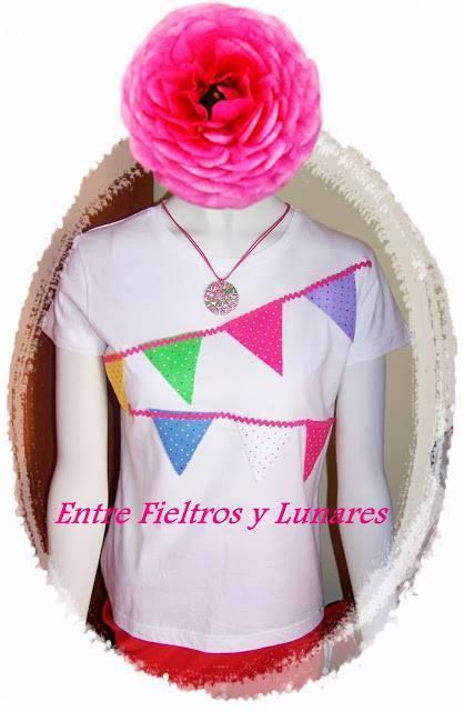Conjunto de camiseta blanca de manga corta talla L de roly, con motivos de banderolas en fieltro estampado de lunaritos y cosidas a mano con piquillo fucsia