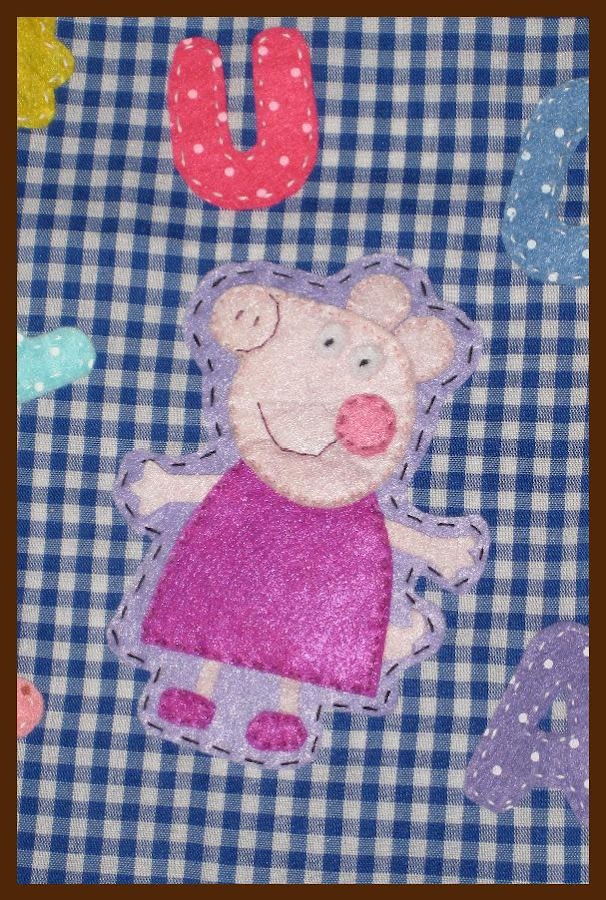 Por lo demás dificultad 0, un rectángulo de tela cosido a máquina y tanto la cerdita como las letras fueron todo cortado en fieltro y aplicado a mano sobre la bolsa. La cerdita la monté primero sobre una base de fieltro lila, que después recorté y aplique sobre la bolsa (lo hice así pensando que si la bolsa se rompía o quería hacer una nueva, sólo tenía que separar la base y tendría de nuevo a Peppa, no tendría que ir montando de nuevo todas las piezas). Los bracitos y la colita están sin coser del todo, para darle un poco de "movimiento" al muñeco, de momento duran y han aguantado más de un tirón...