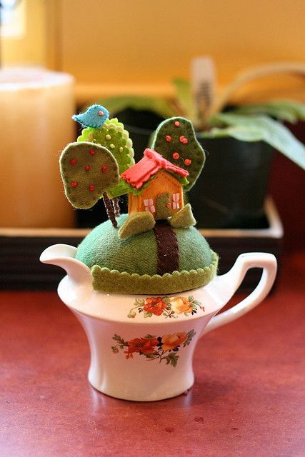Pero ¿y si decidís que eso de la lana afieltrada no es lo vuestro? No hay problema: aquí os dejo unas fotos con una variante más sencilla que casi no necesita explicación: se realiza casi íntegramente con fieltro del habitual, y la base, la que se mete en la taza, es un pequeño cojín...como un alfiletero, o acerico. Echadle un vistazo..¡no tiene desperdicio!