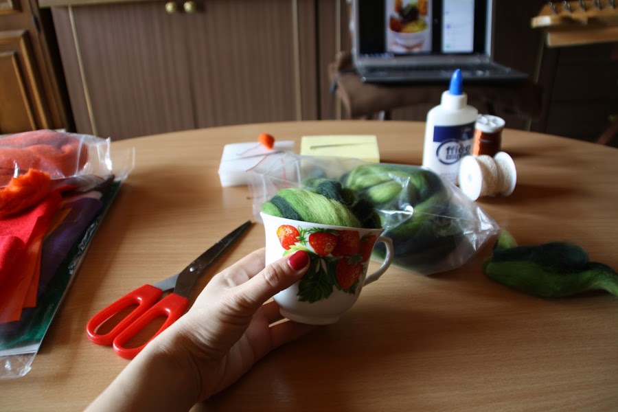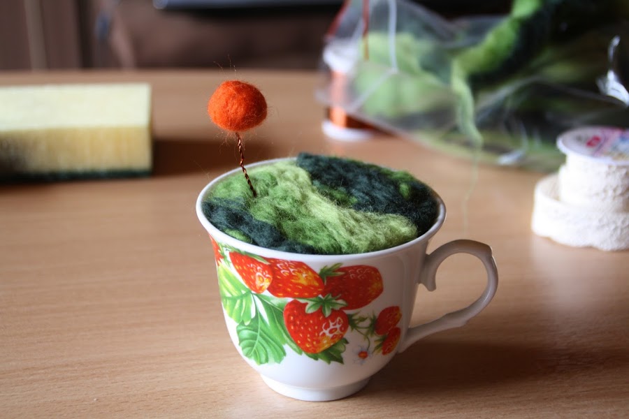 Lo siguiente es rellenar la tacita con la lana que va a servir de base para nuestro paisaje.
