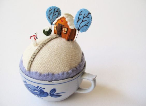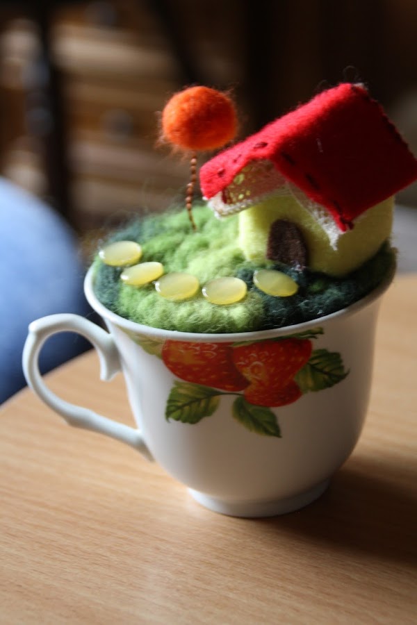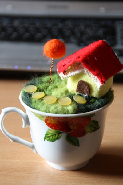 Pero ¿y si decidís que eso de la lana afieltrada no es lo vuestro? No hay problema: aquí os dejo unas fotos con una variante más sencilla que casi no necesita explicación: se realiza casi íntegramente con fieltro del habitual, y la base, la que se mete en la taza, es un pequeño cojín...como un alfiletero, o acerico. Echadle un vistazo..¡no tiene desperdicio!