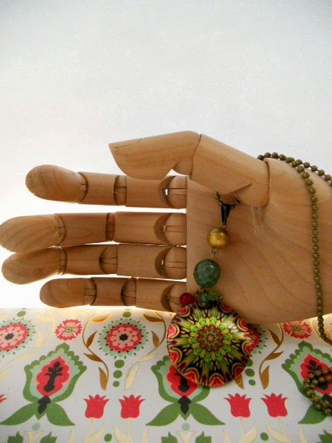 Precioso y fino collar, con aire vintage; muy adornado y con medallón central.- Está realizado con la técnica rosario, pero con un eslabón intermedio, pueden ser argollitas bien reforzadas o eslaboncitos de cadena, el metal de base es el bronce. Pero los “touch” de dorado le dan más vida Las cuentas son bastante grandes, pero pocas porque el collar es corto, aunque no es gargantilla. ...