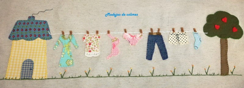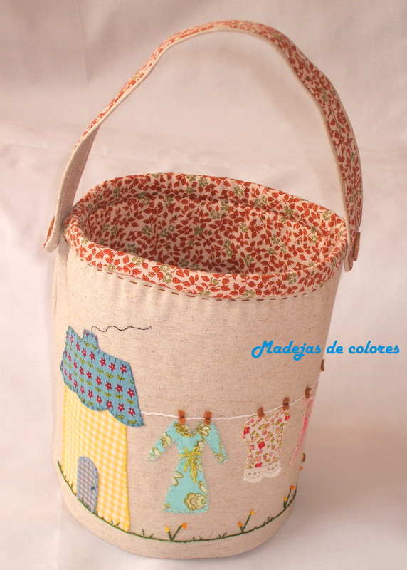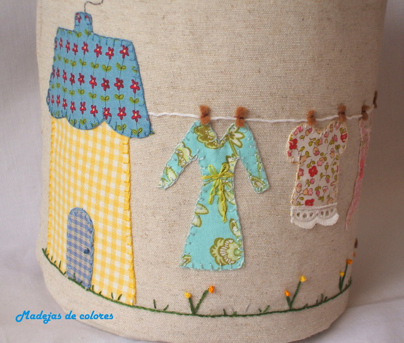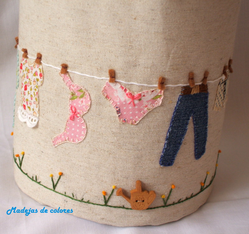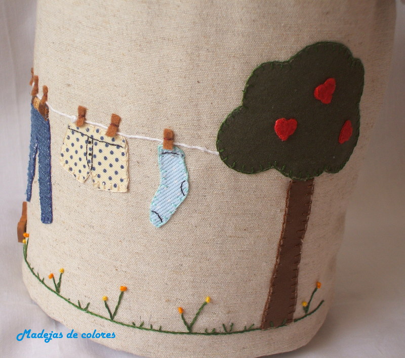 También le hice como sorpresa, una bonita cesta donde guardar las trabas o pinzas de ropa. Sobre un fondo natural, diseñé una casita y árbol, de donde van tendidas la ropa a lo largo, con aplicaciones a festón.
