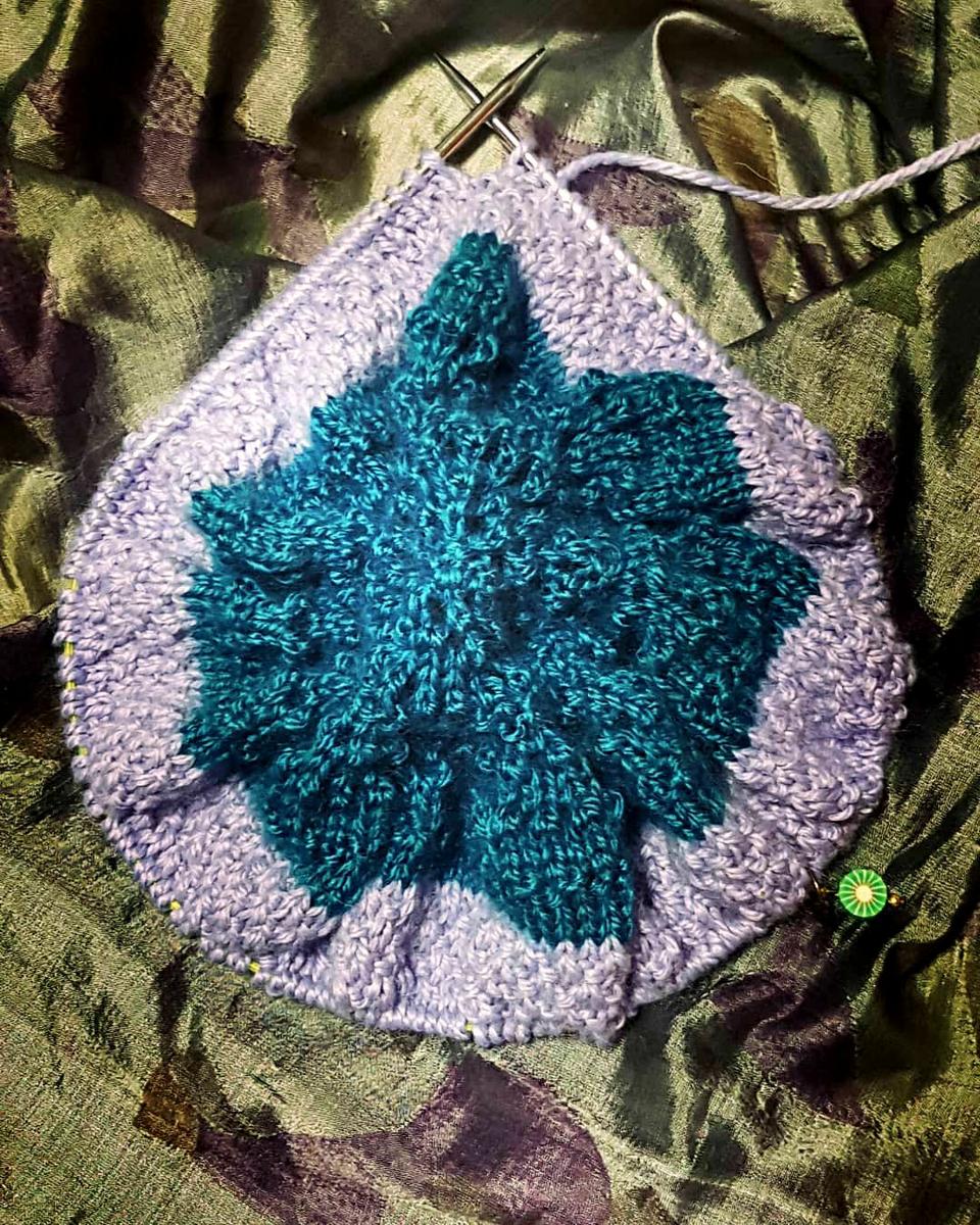 Salvo en las hileras 27 y 28, que las trabajé en punto arroz, el resto de las hileras las tejí en jersey. En la hilera 31, cambié al color lila y luego de tejer 2 hileras en jersey, trabajé 26 hileras en el punto fantasía de arroz, llamado «picado doble»