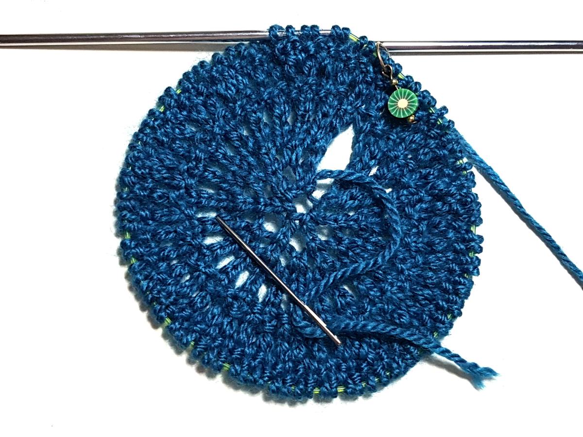 Sólo resta decir que con ayuda de la aguja de coser lana y aprovechando la hebra de inicio, se unirán ambos bordes y luego de fruncir firmemente los 5 puntos iniciales, se procederá a coser un lado con otro, aprovechando el punto de borde en jersey de cada lado. En el caso de haber pasado a trabajar con aguja circular, la costura sólo abarcará la parte tejida a dos agujas.