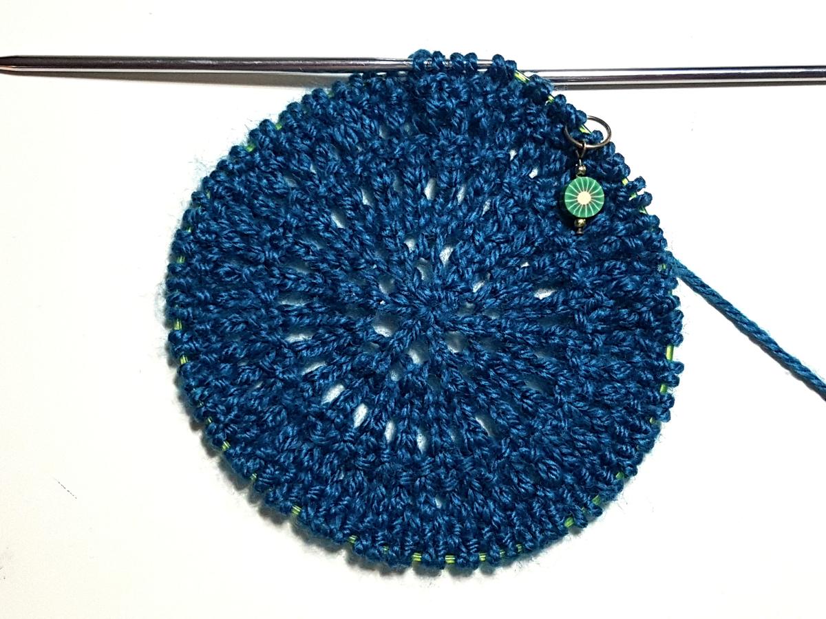 -Luego de tejer la siguiente hil. al revés, se han tejido un total de 18 hileras que permiten tener la base circular de cualquier diseño. A este círculo básico, se le podrá seguir agregando nuevas hileras de aumentos (alternando 1 punto derecho y lazada), según la necesidad de puntos que requiera el diseño a realizar.