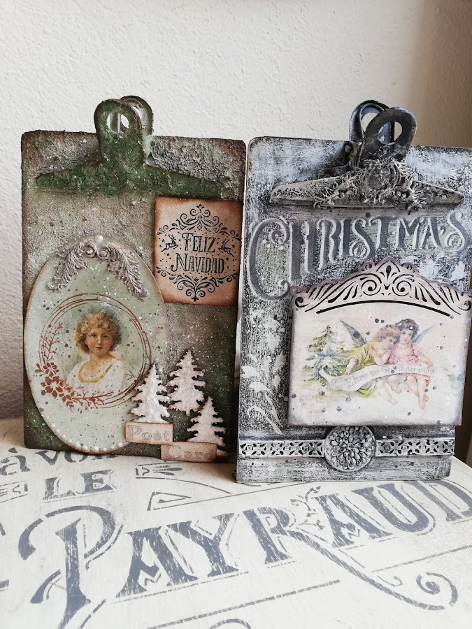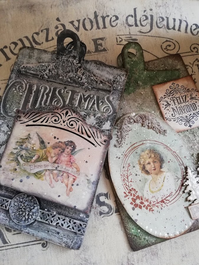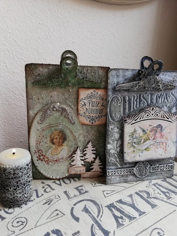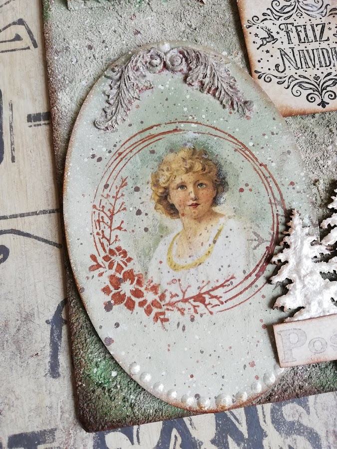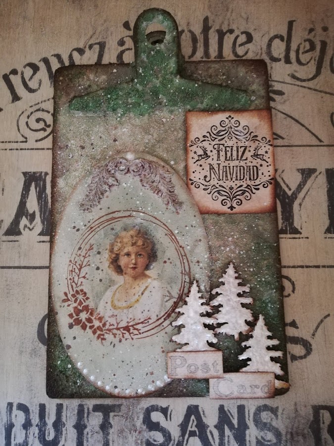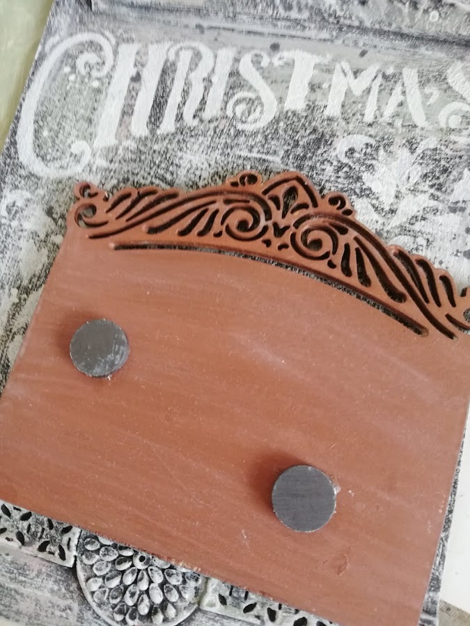 En este he pintado con pintura imantada(me sobró muchisima en los talleres de los calendarios perpétuos, asi que habrá que ir utilizándola jiji) lleva 3 capas de pintura imán, encima a pincel seco dí blanco, rosa vintage y verde vintage de Chalk paint Mya, dejando secar entre capas. Luego estarcido con plantilla navideña nueva y figuritas hechas con los moldes nuevos de silicona y pasta Flex. El tag decorado con papel de arroz, lleva unos imanes por detrás `pegados para que se adhieran a la madera imantada.