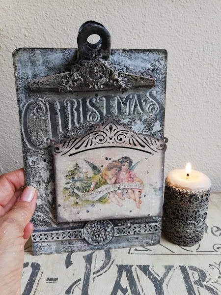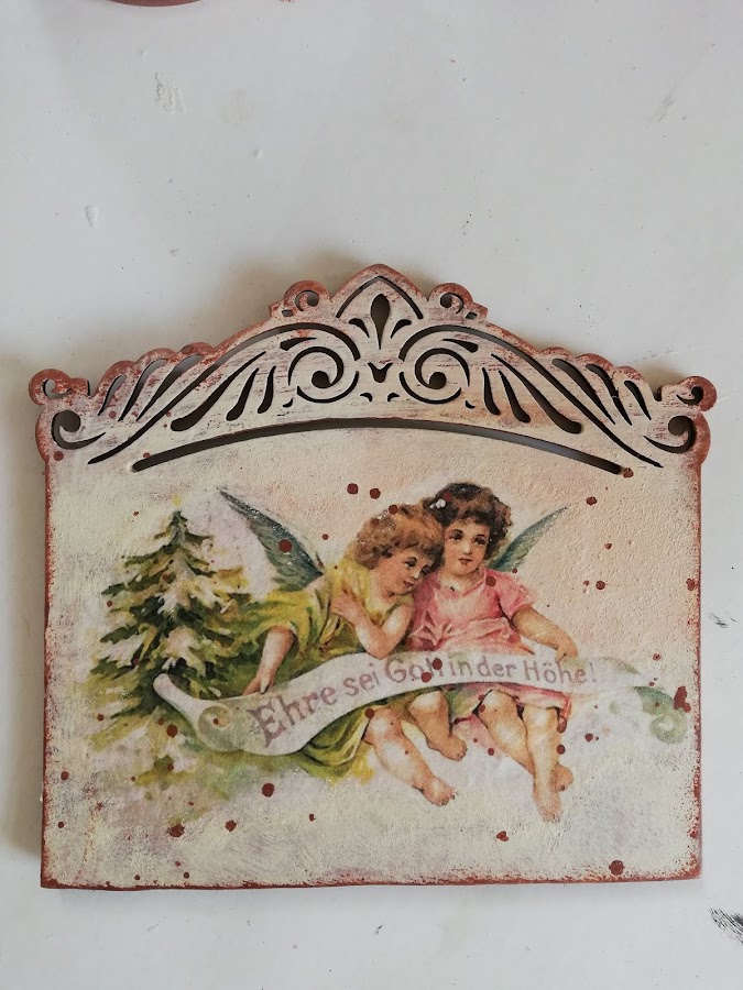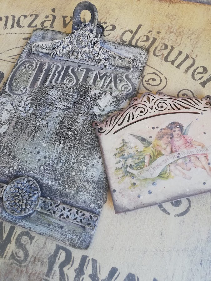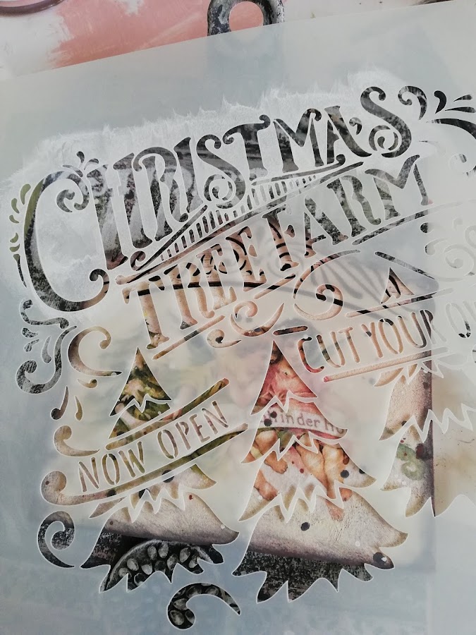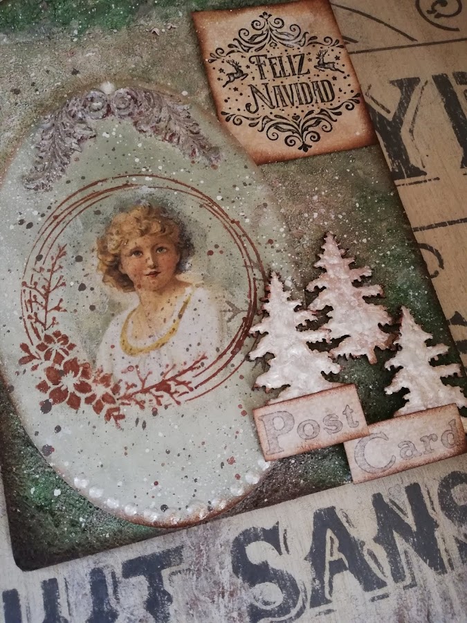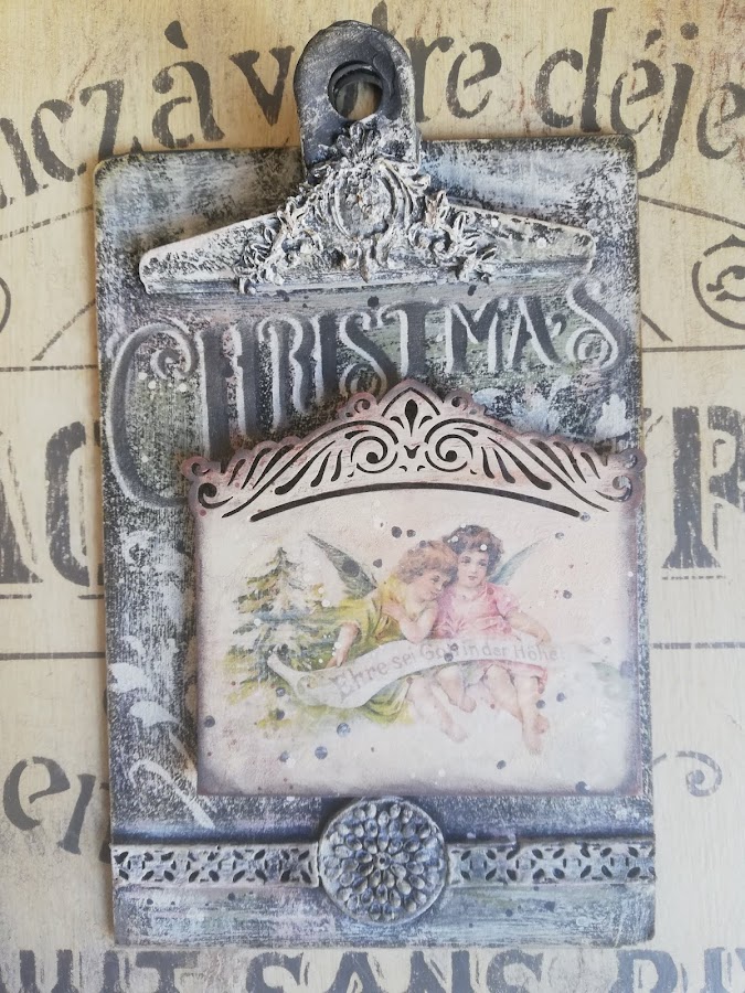 En este he pintado con pintura imantada(me sobró muchisima en los talleres de los calendarios perpétuos, asi que habrá que ir utilizándola jiji) lleva 3 capas de pintura imán, encima a pincel seco dí blanco, rosa vintage y verde vintage de Chalk paint Mya, dejando secar entre capas. Luego estarcido con plantilla navideña nueva y figuritas hechas con los moldes nuevos de silicona y pasta Flex. El tag decorado con papel de arroz, lleva unos imanes por detrás `pegados para que se adhieran a la madera imantada.