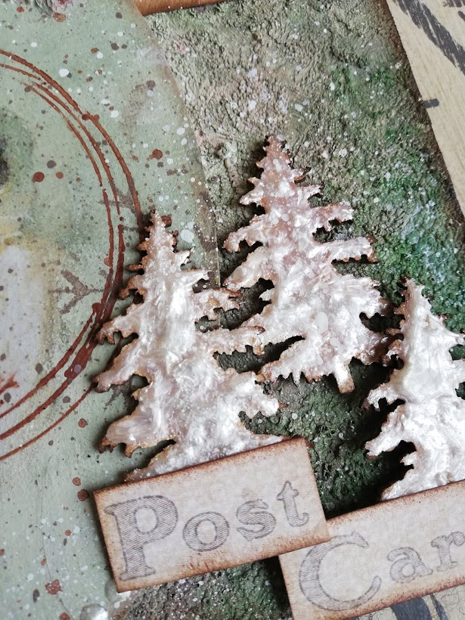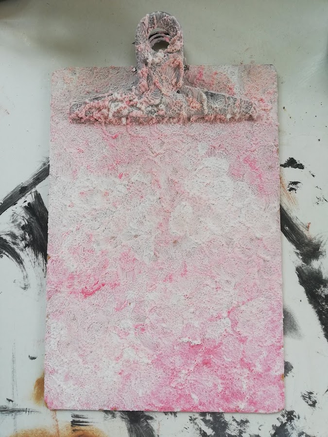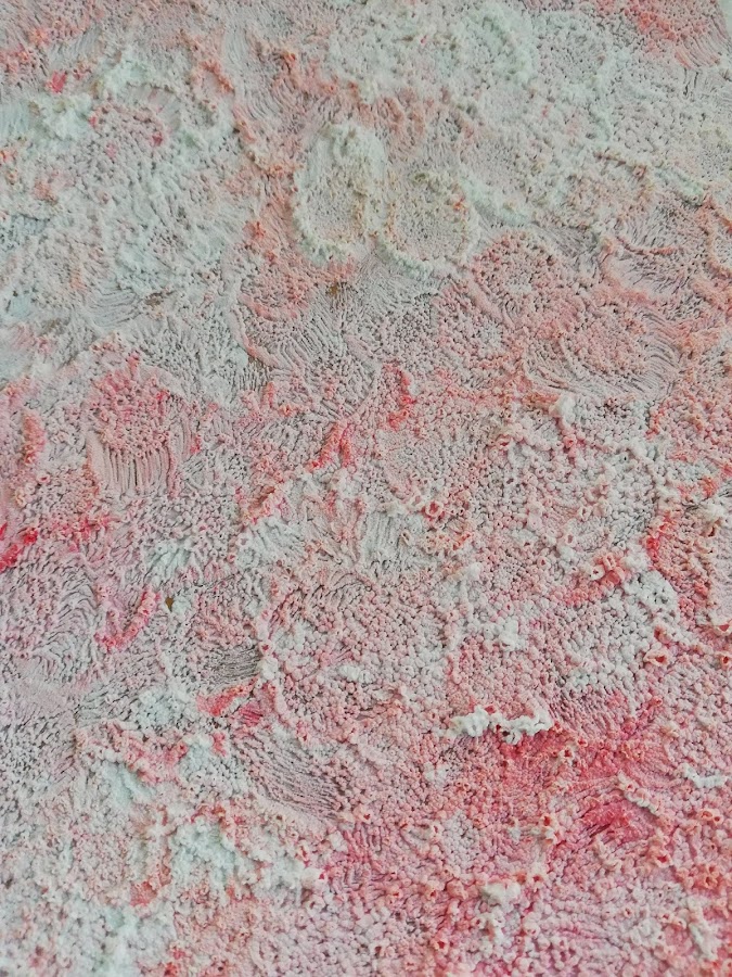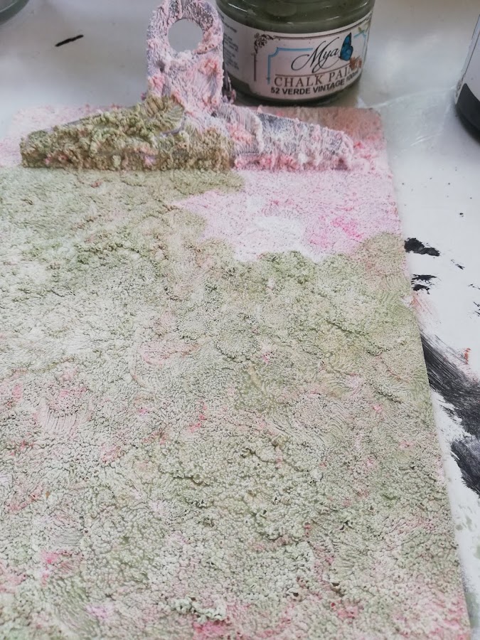 El otro, de tonos verdosos, lo he hecho primeramente dando la Foam paint....tenía un resto de haber mezclado blanco y rojo y quería terminar de gastarla. Sabía que no lo dejaría de ese tono rosado.....lo que me importaba más que el color, era la textura que me tiene enamorada¡