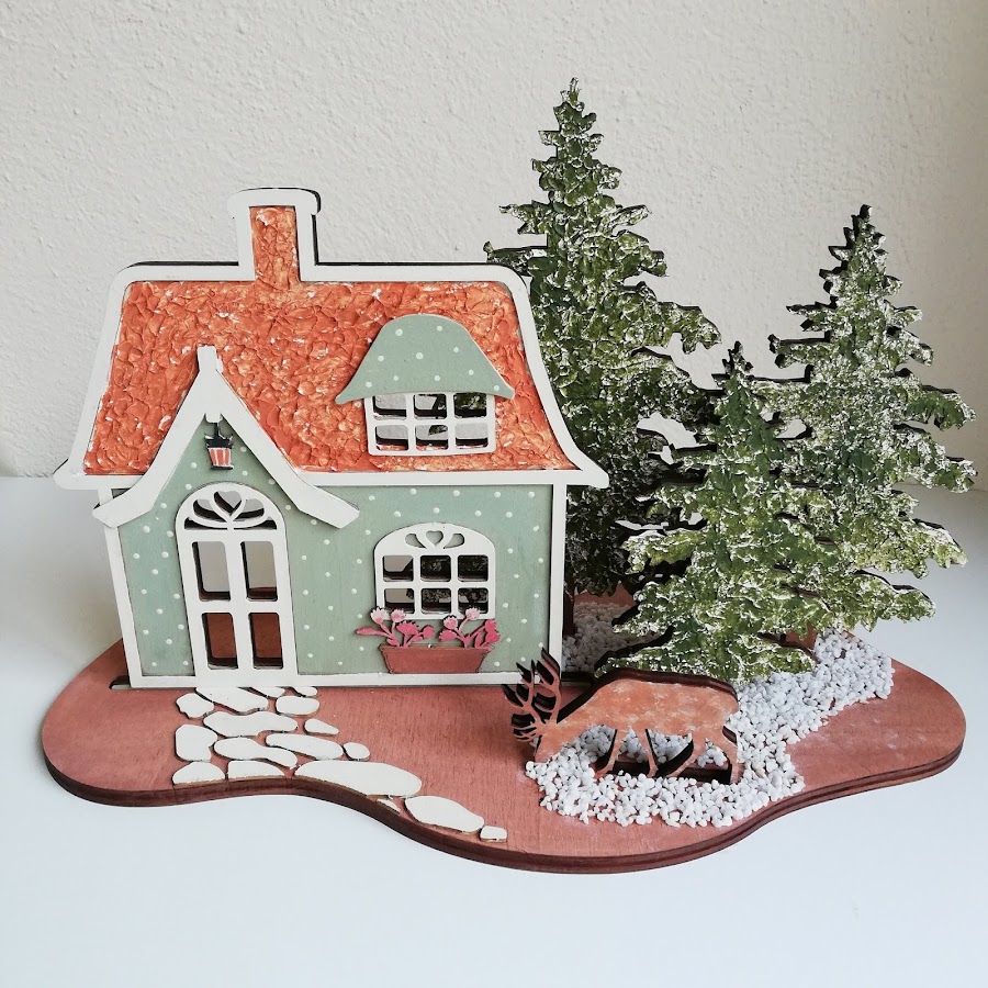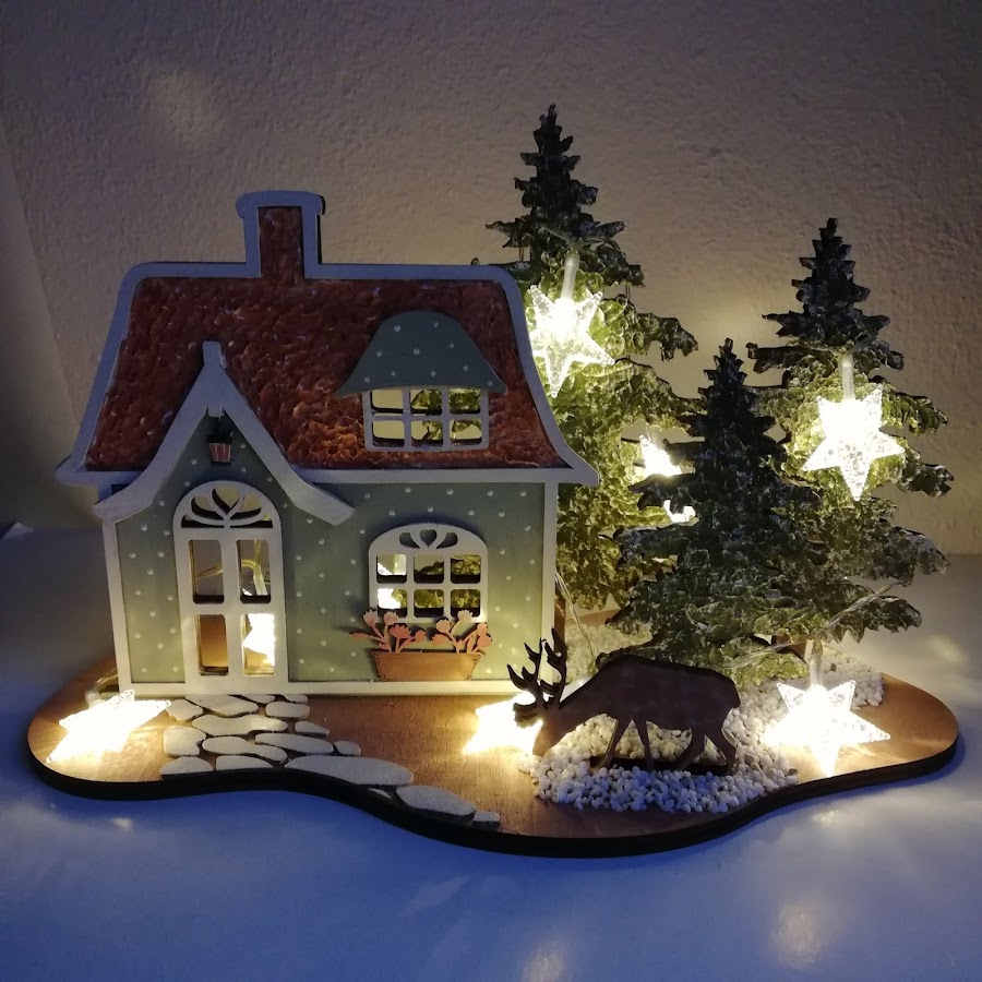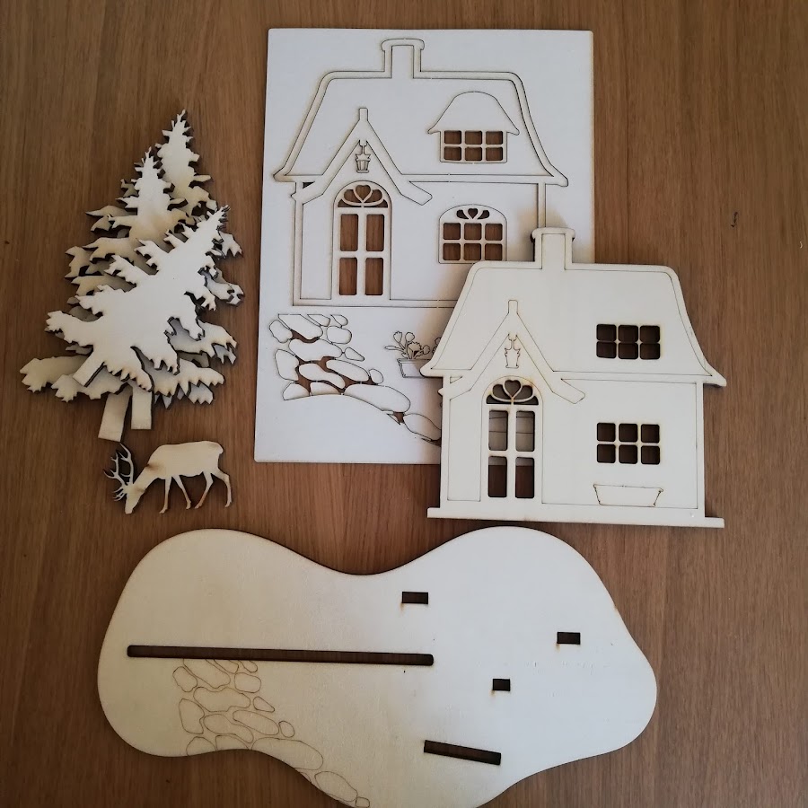 Este es el kit completo que lleva la base, 3 abetos, 1 ciervo, la casita de madera y otra igual pero de cartón...desmembrando las piezas de cartón las iremos pegando donde encajen en la de madera para conseguir un poco de volumen.