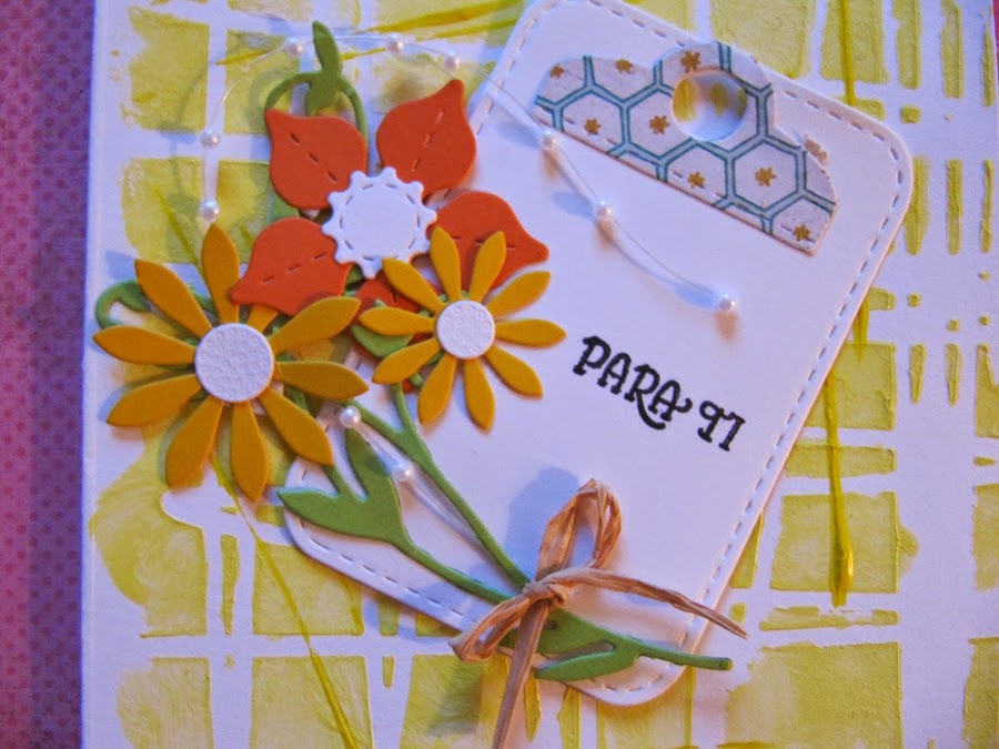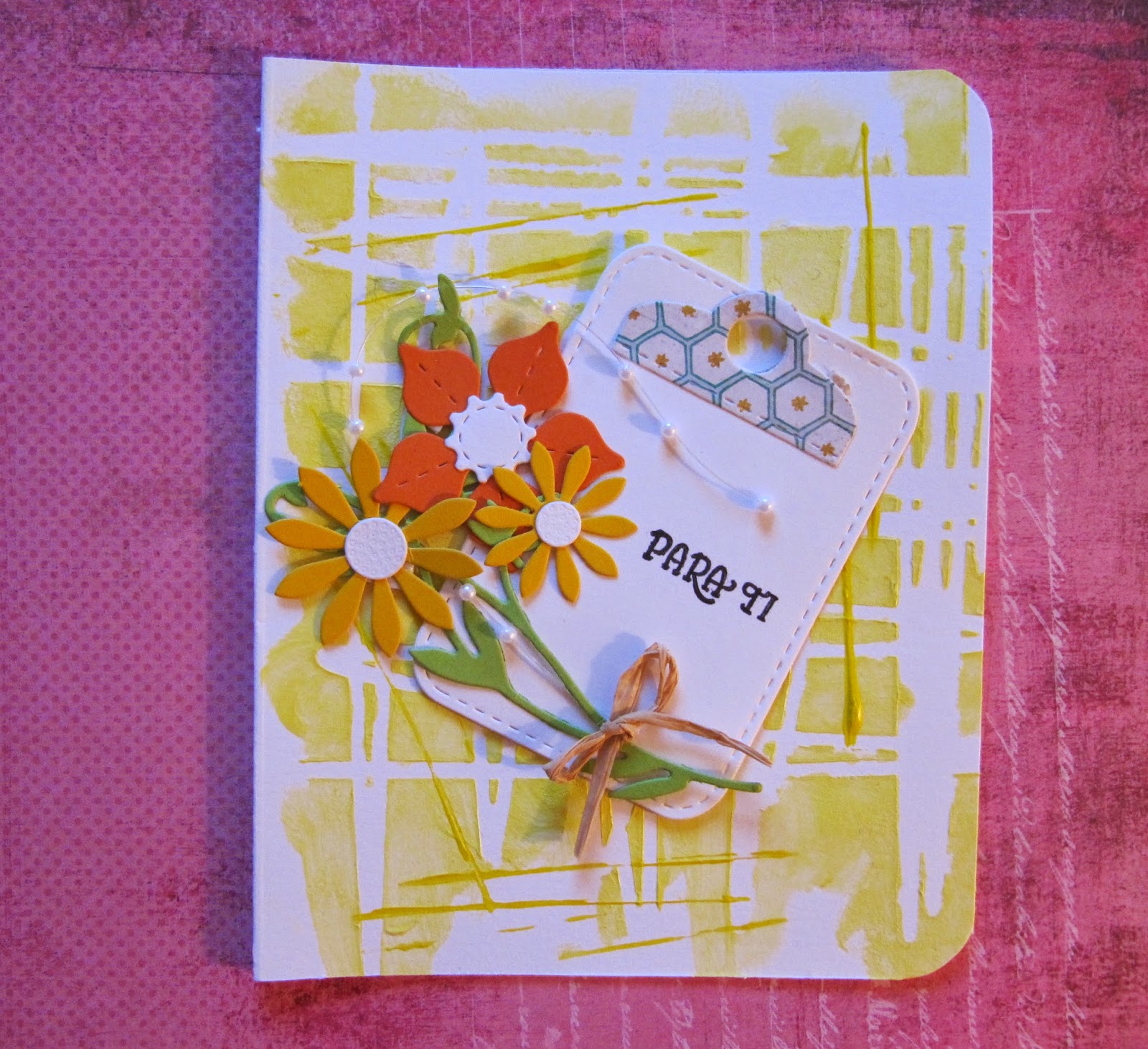 Siendo para mi el protagonista el amarillo, he utilizado una plantilla y acrílica para el fondo, las flores y el tag son troqueles
