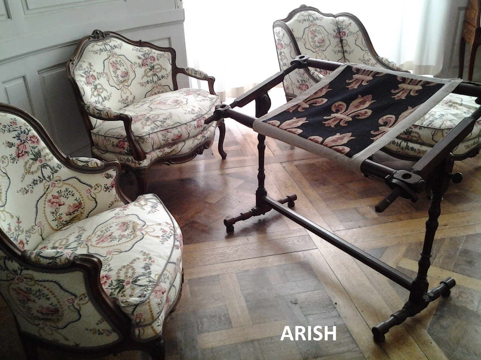 también me llamó la atención éste bonito rincón de costura que se encuentra en el castillo de Chambord, pero ya vale de rollo viajero y a lo que estamos, despues de visitar la capilla del Sacré Coeur en el barrio de Montmâtre, tomamos café y paseamos por las calles donde están los pintores y al final de una calle unos grandes letreros azules en forma de banderas en una fachada me llamaron la atención, sé un poquito de francés, lo suficiente para defenderme pero no conozco todas las palabras y la palabra que había escrita en ésos carteles la desconocía y al llegar ¡¡¡¡¡ohhhhhh, mon dieu.........!!!!! ............... ¡¡¡¡¡telassssssssssss.......!!!!! pura casualidad y entré........ y salí con dos bolsas llenas y no me llevé más por no ir tan cargada, aunque mi maridito me las llevó todo el tiempo, y porque en las maletas no me cabían