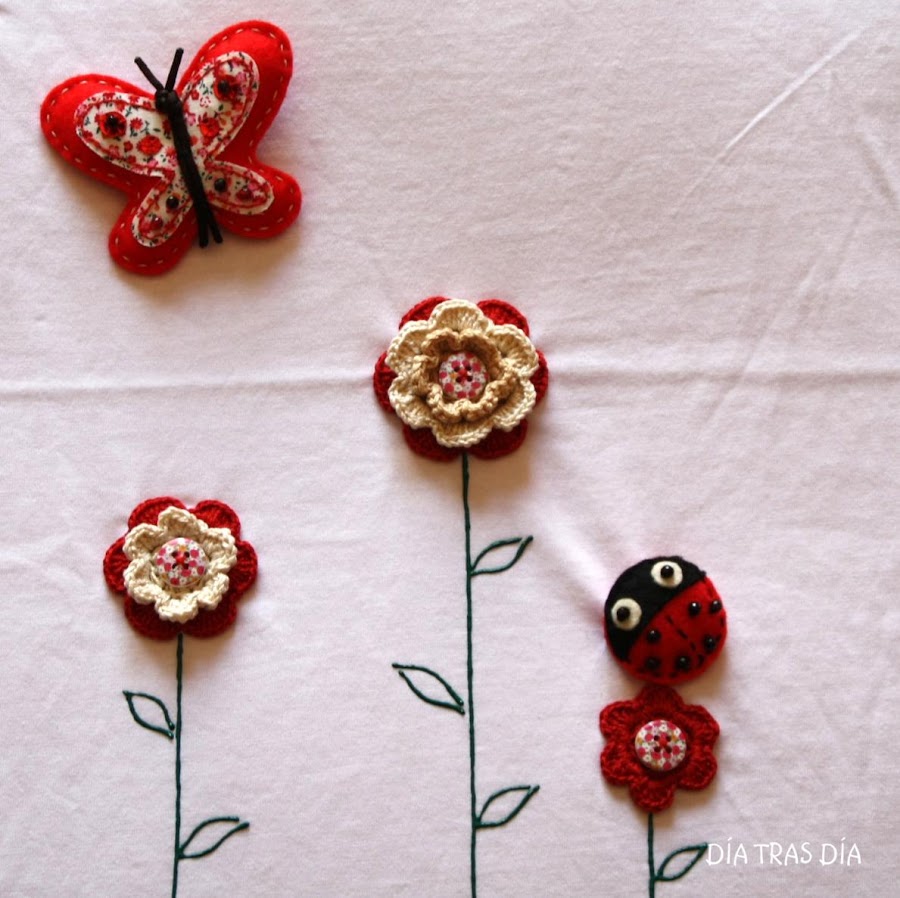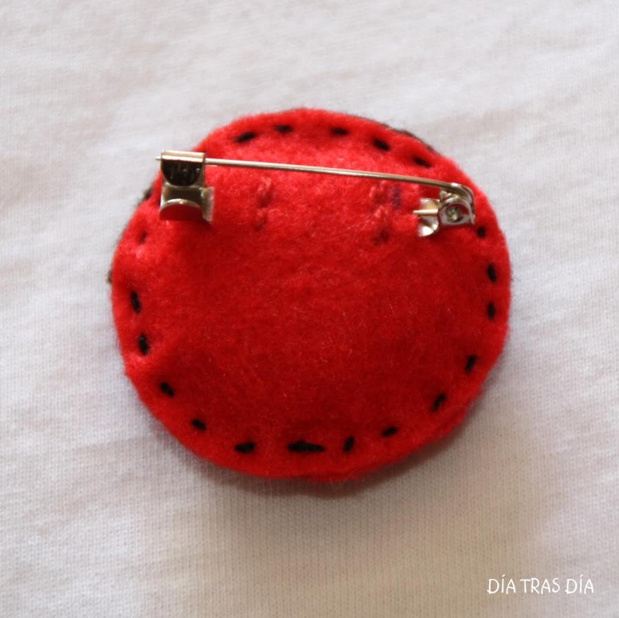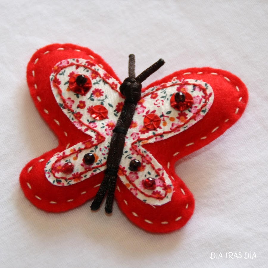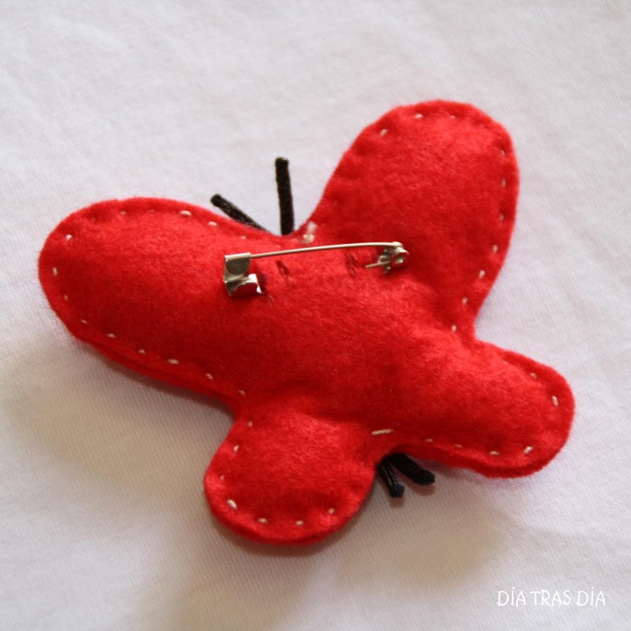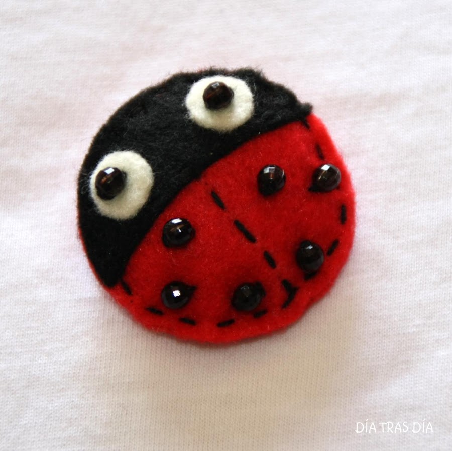 De pronto me vino la idea definitiva a la cabeza: la mariposa iba a ser un broche de fieltro, de forma que se pudiese colocar en cada momento en el lugar que más gustase. Y ya que estaba, para alegrar un poco más la camiseta, le añadí otro pequeño broche, esta vez de una mariquita.
