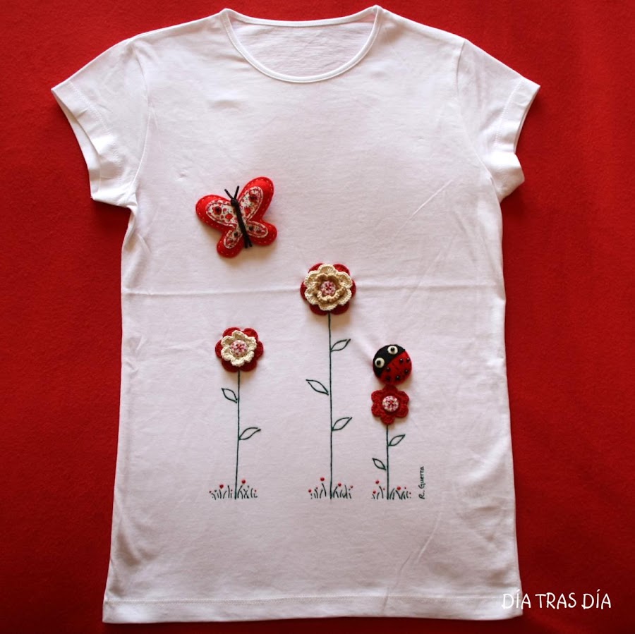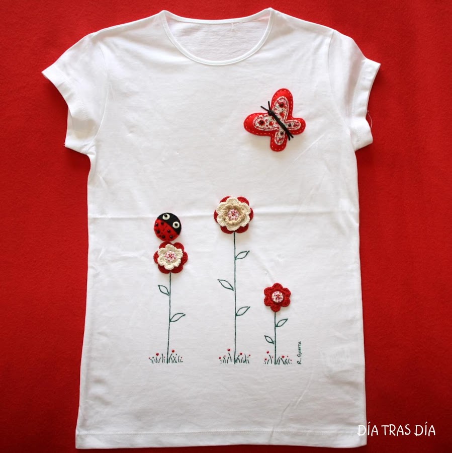 La camiseta tiene su particular historia. Hace un par de días, Inma me dijo que quería hacerme un encargo de una camiseta para un regalo, con urgencia, porque era para regalar en esta semana. Le dije entonces de hacer alguno de los modelos que hago ya con los ojos cerrados. Pero me comentó que a su destinataria le gustaban mucho las mariposas, así que a ver si podía hacerla con este motivo.