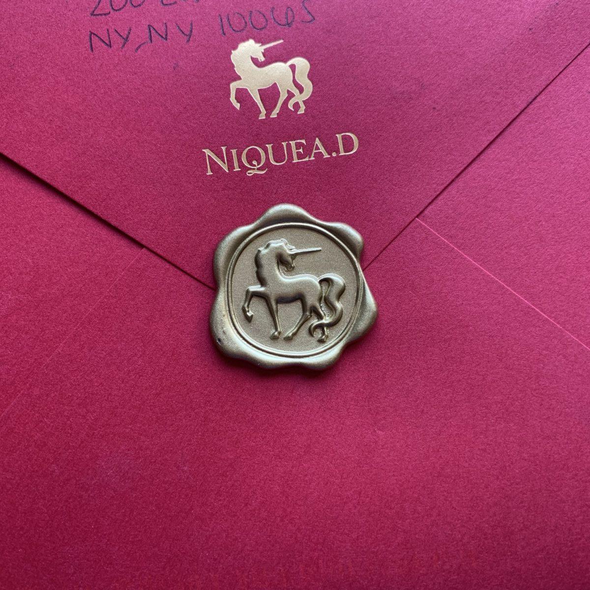 Un reno, un lobo, un conejo y una ardilla que esperan a Papá Noel. Un sobre rojo con varias estampillas de un niño jugando en la nieve, y en el reverso un sello dorado exquisito.
