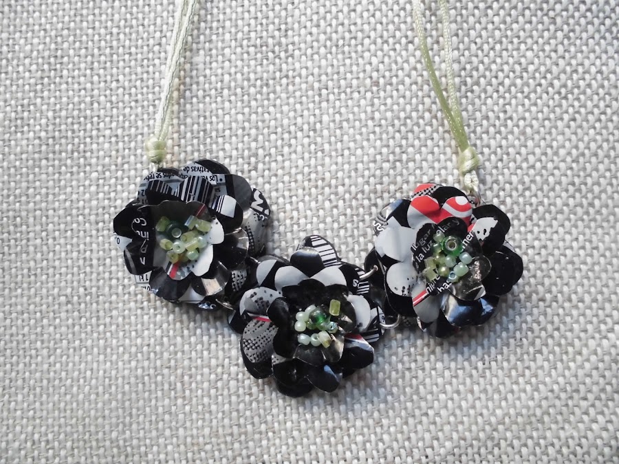 Los collares los hice con latas de refresco de diferentes bebidas, unas argollas por aquí , cola de ratón por allá y unas mostacillas de colores combinados.