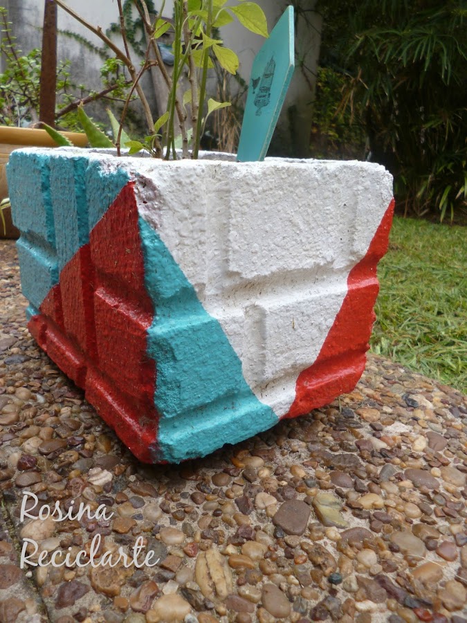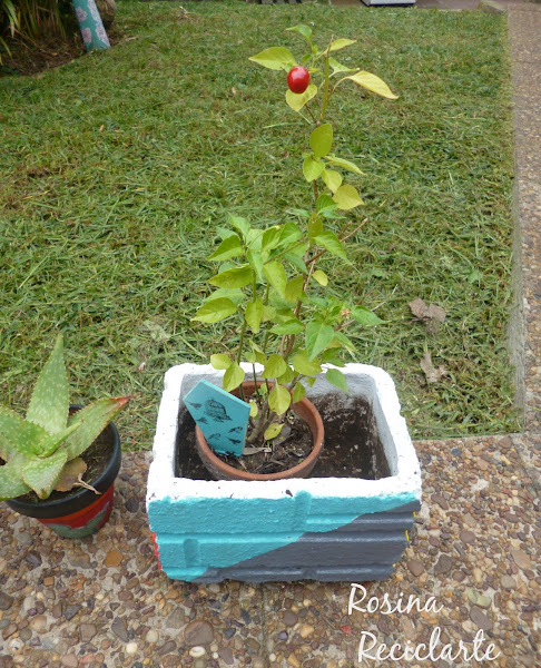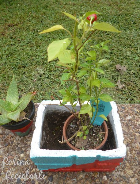 Y después a combinar colores a libre antojo, muchas manos de barniz y listo, macetero nuevo para mi ají baby.