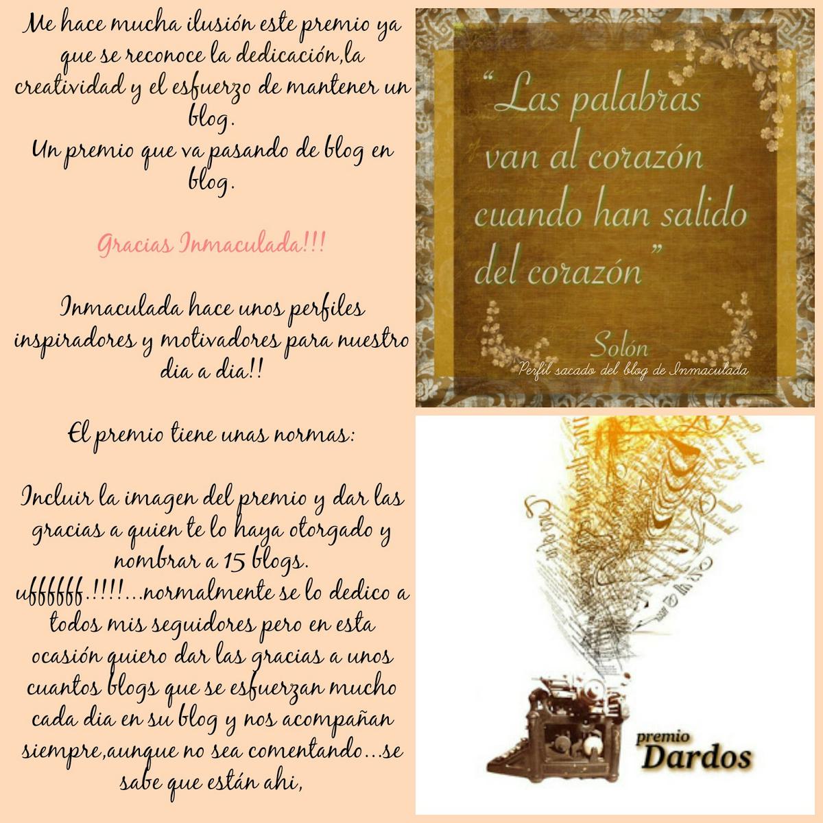 Además tengo que agradecer a Inmaculada del blog Perfileando porque me ha otorgado el premio Dardos.