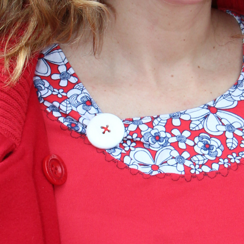 La camiseta la he cosido con punto interlok rojo, tela de camiseta estampado de flores y puños color tejano. Si, si, discretita jajaja