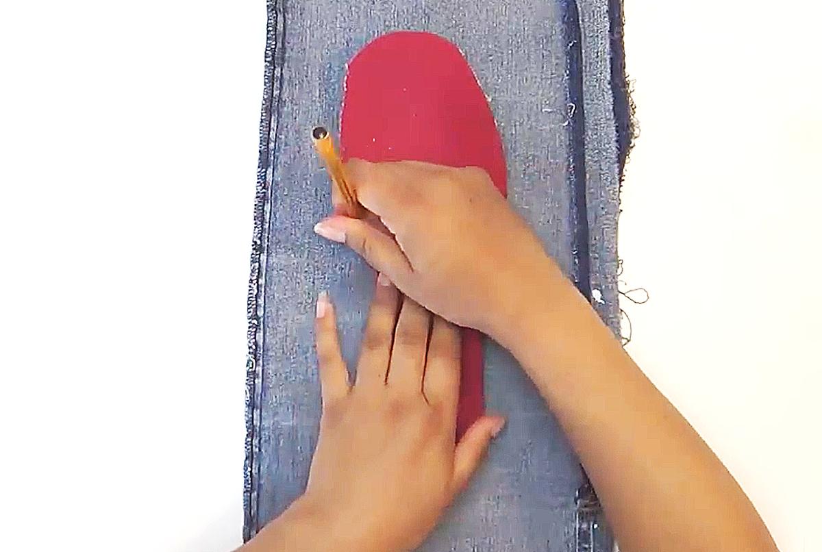 Descarga la plantilla, marca y corta 2 veces en jeans y 2 veces en tela de forro.