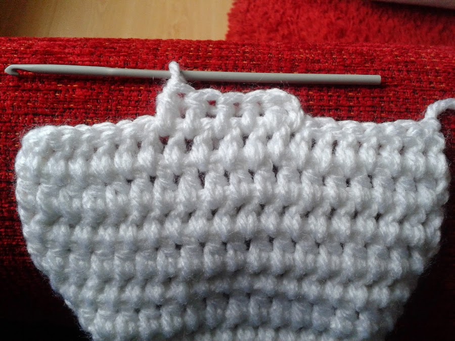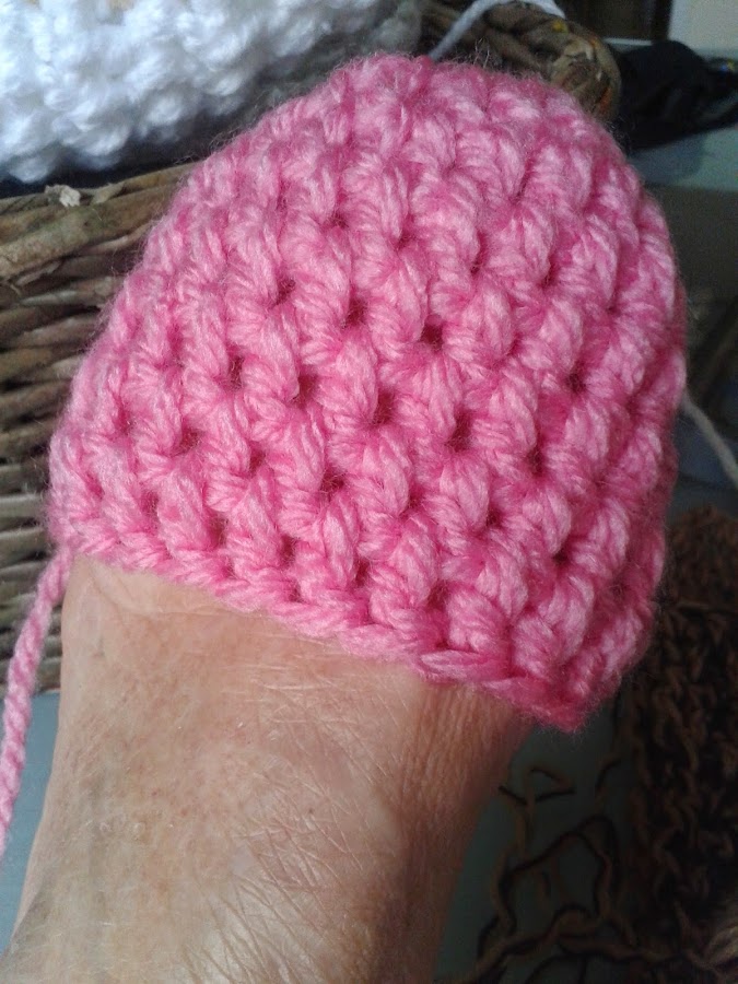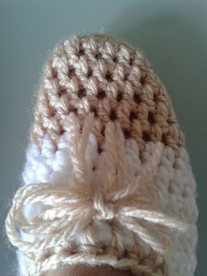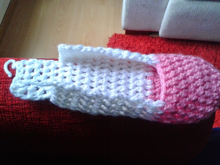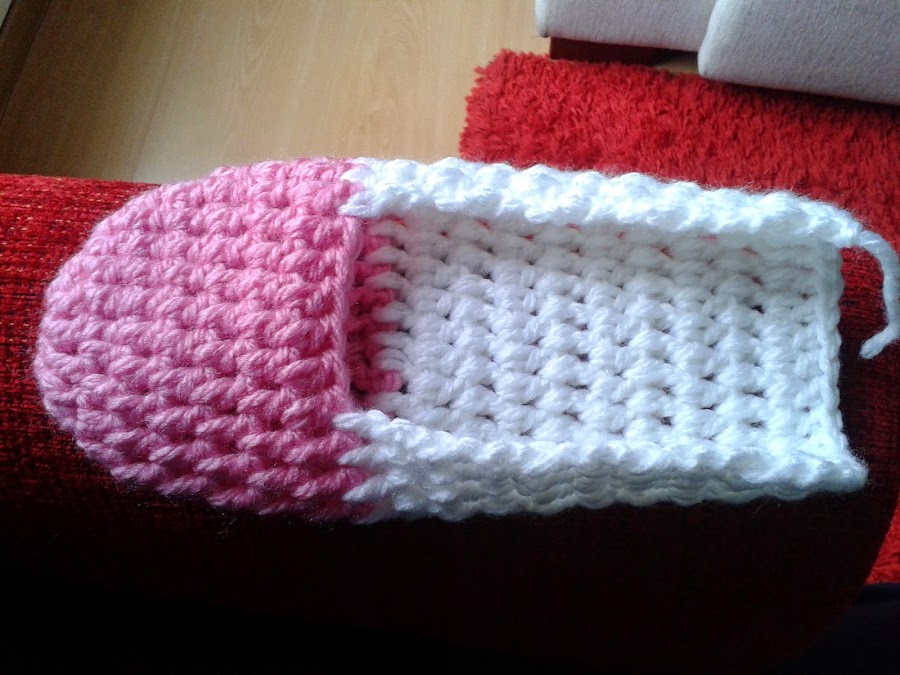 Como veis en la foto de la izquierda, es como si os pusierais un gorro en el pie.Si las queréis más cerrada, como la primera foto, ( la zapatilla beige y blanca), tendréis que hacer las vueltas suficientes para que os llegue tan arriba como queráis, teniendo en cuenta que no debéis aumentar ya el punto que veníamos aumentando en cada vuelta, porque si no, os quedarían anchísimas, eso ya lo vais viendo vosotros, según os la vais probando, os aconsejo que vayáis apuntando las vueltas y los puntos para que cuando hagáis la segunda zapatilla, os quede exacta.