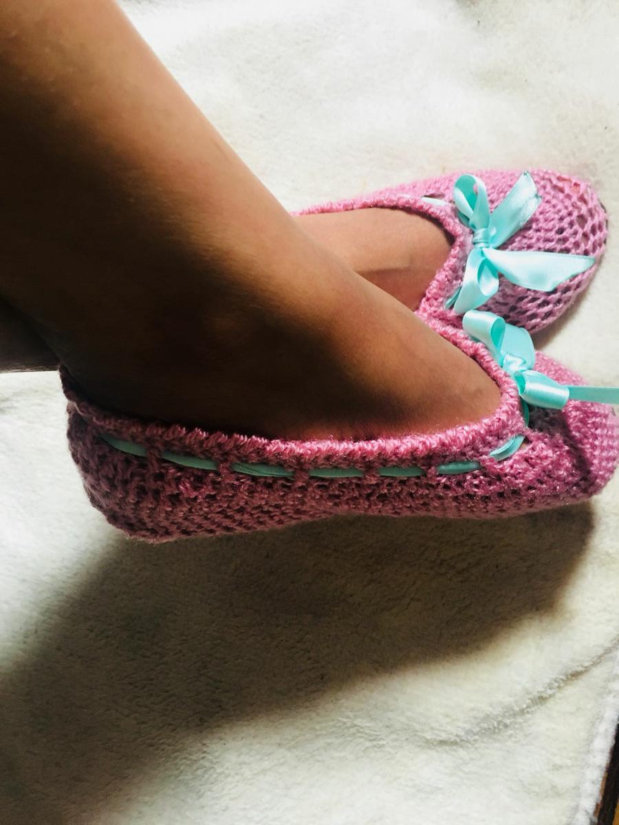 Fresquitas para el tiempo que viene, la verdad que tenía que haberlas hecho de lana , porque el cumpleaños fué en enero, pero más vale tarde que nunca y tan contenta que está con sus zapatillas