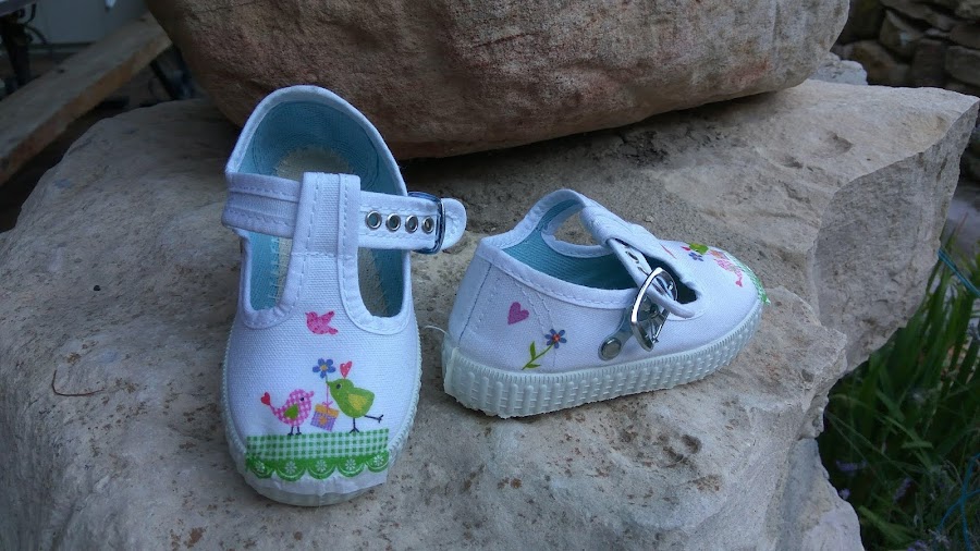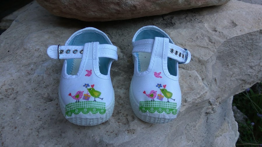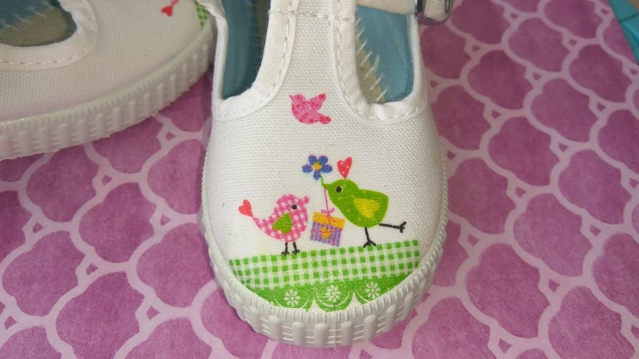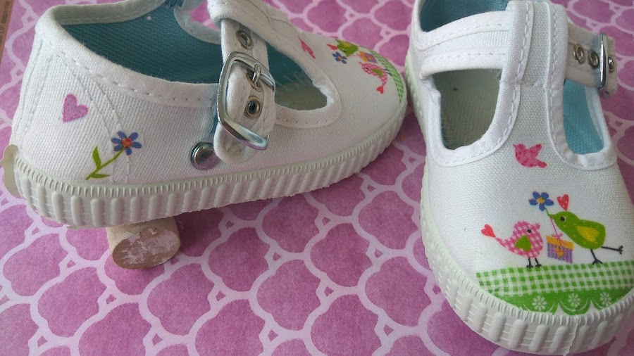 Se trata de la técnica Decoupage en tela aplicada a unas zapatillas utilizando un pegamento especial y una servilleta con motivos infantiles.