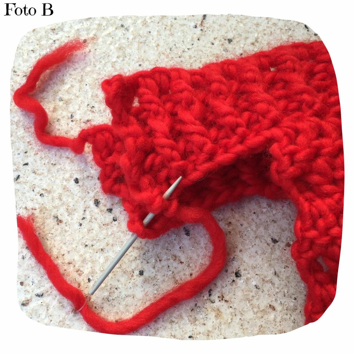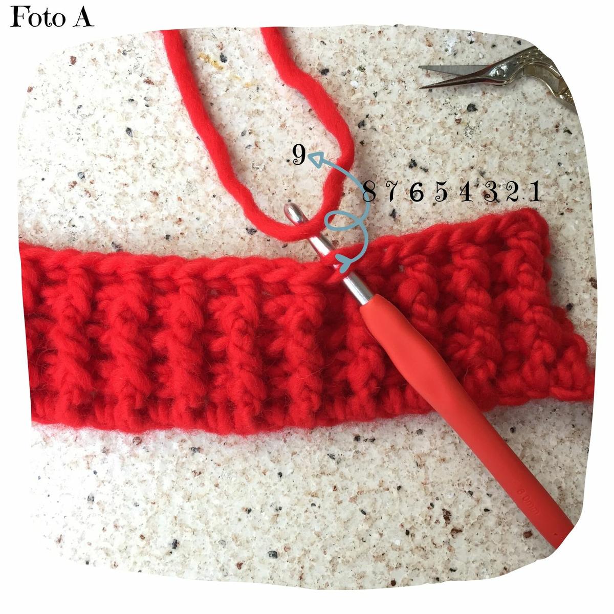 Cambiar a aguja de 6 mm, comenzamos la siguiente vuelta en el 9º punto de la vuelta anterior (Ver foto A)