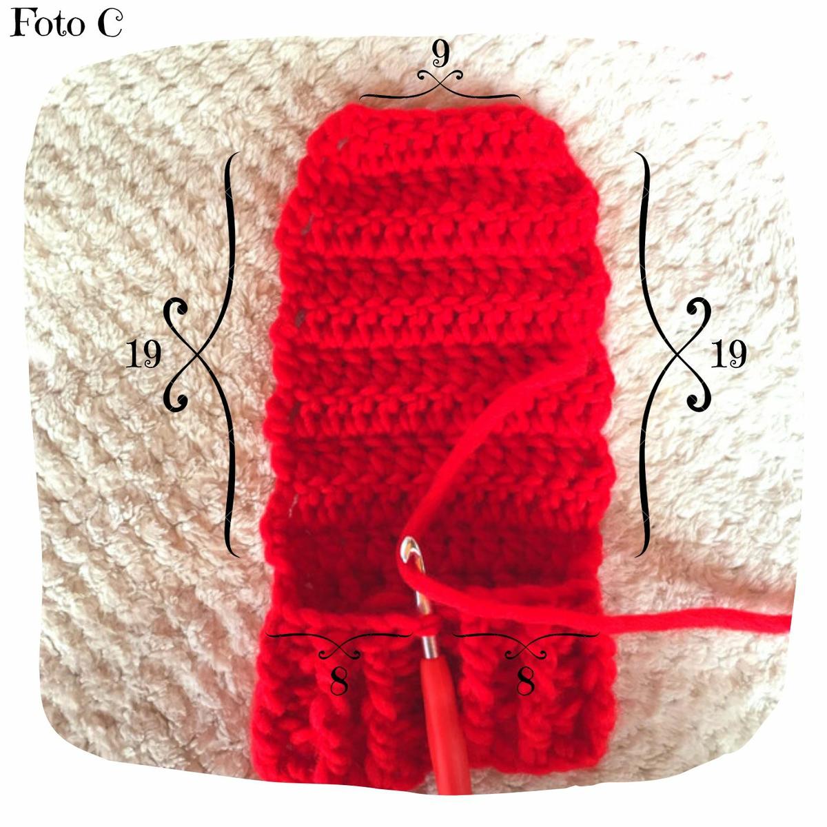 Luego hacer 3 vueltas de punto bajo alrededor desde la costura de la caña. (Ver foto C)