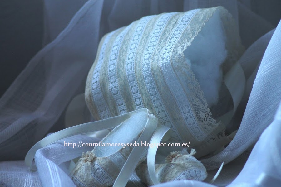 Queridas amigas. Ya sabéis que en la fotografía, la primera condición para que salgan algo bien, por que salir bien totalmente, casi no se consigue nunca, bueno. . pues la primera condición, indispensable es la luz, sin luz no hay foto, no voy ahora a explicar por que hay tantas fotos que se hacen de noche y son magníficas, no, ahora no lo voy a contar, quiero deciros estas de andar por casa, pues eso, que como no hay mucha luz, donde las hice, salen azuladas, ya me ha pasado mas veces, que vamos a hacerle, lo que quiero, es enseñaros estos zapatitos que acabo de terminar, para un lindo faldón que he restaurado, junto con la capota. . aquí están, ya me diréis si os han gustado.