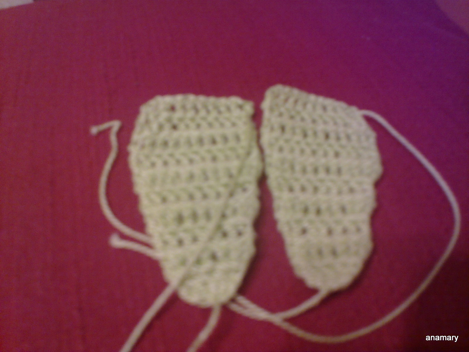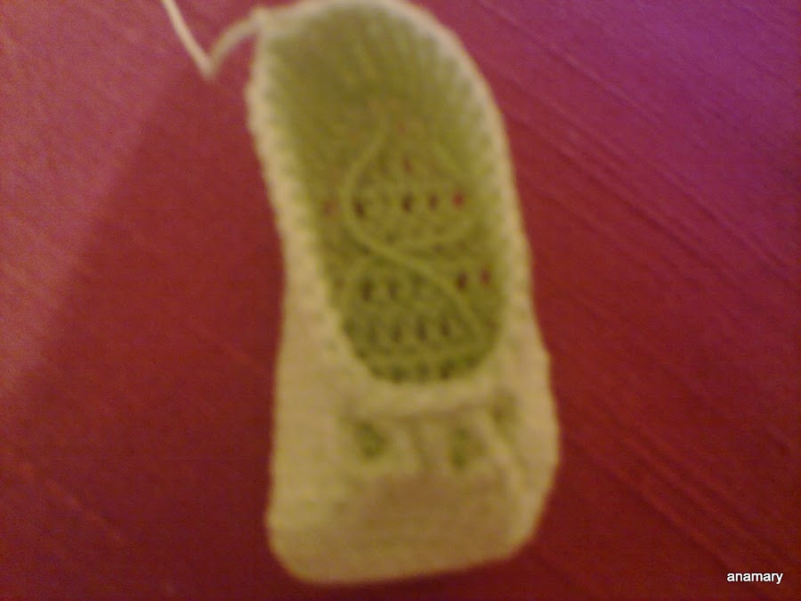 ahora vamos hacer la parte del pie,trabajamos alrededor de la plantilla una vuelta a punto bajo ,haciendo dos puntos en cada arco