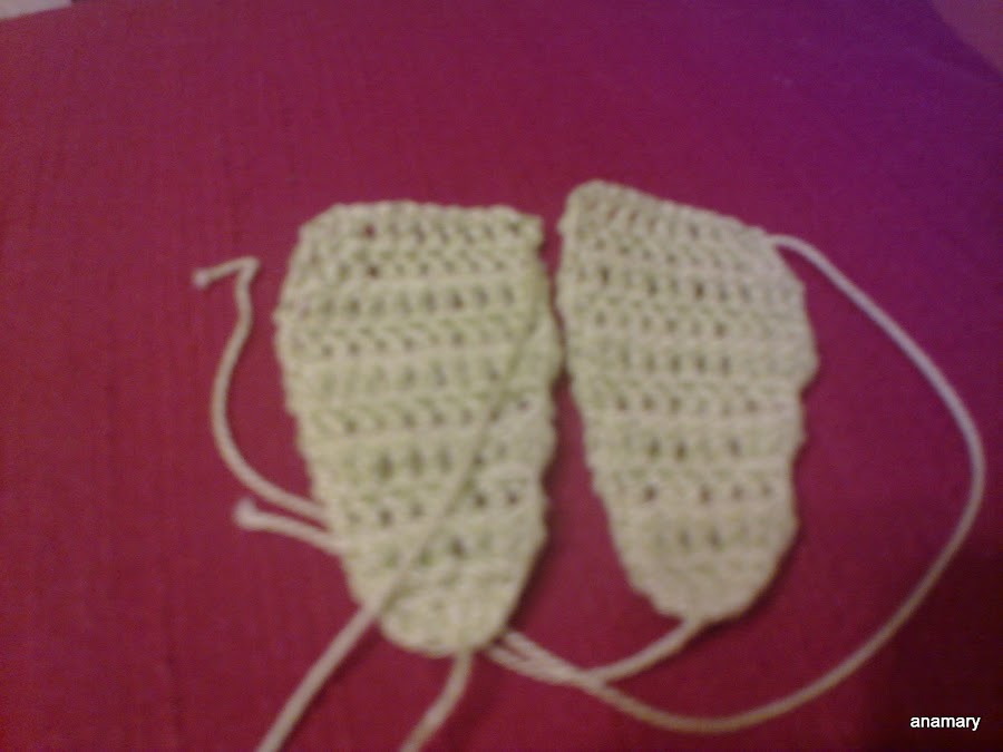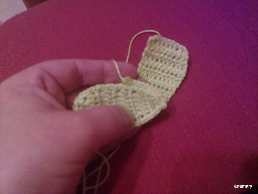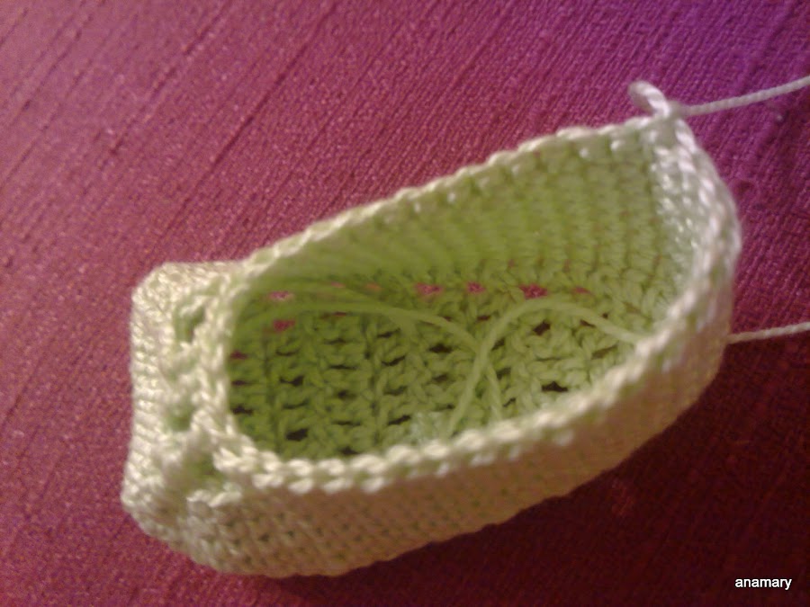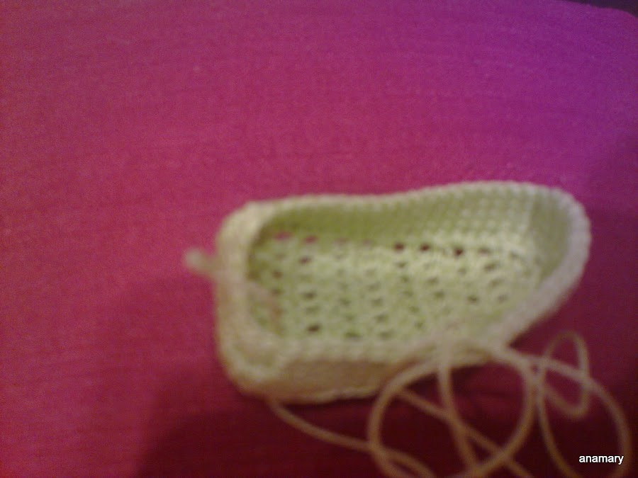 vamos hacer la puntera del zapato,trabajamos a punto bajo y al llegar a la punta del zapato trabajamos tres puntos bajos juntos,seguimos a punto bajo y hacemos lo mismo en la otra esquina del zapato