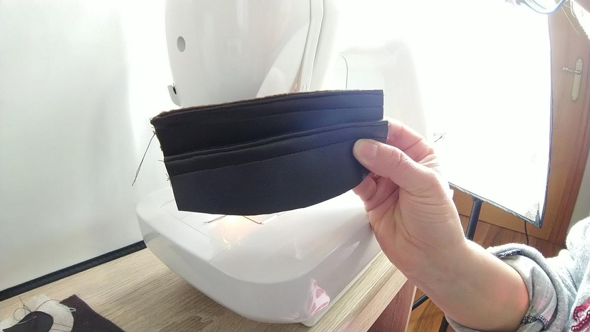 Cuando tengamos terminada la costura, le damos la vuelta, y doblamos la tela principal en el medio del forro, para marcar el ancho de la parte de atrás en ambas esquinas del mismo. Lo cosemos de un lado y del otro, dejando 0,5 cm en los extremos, para poder coser el forro de la suela después: