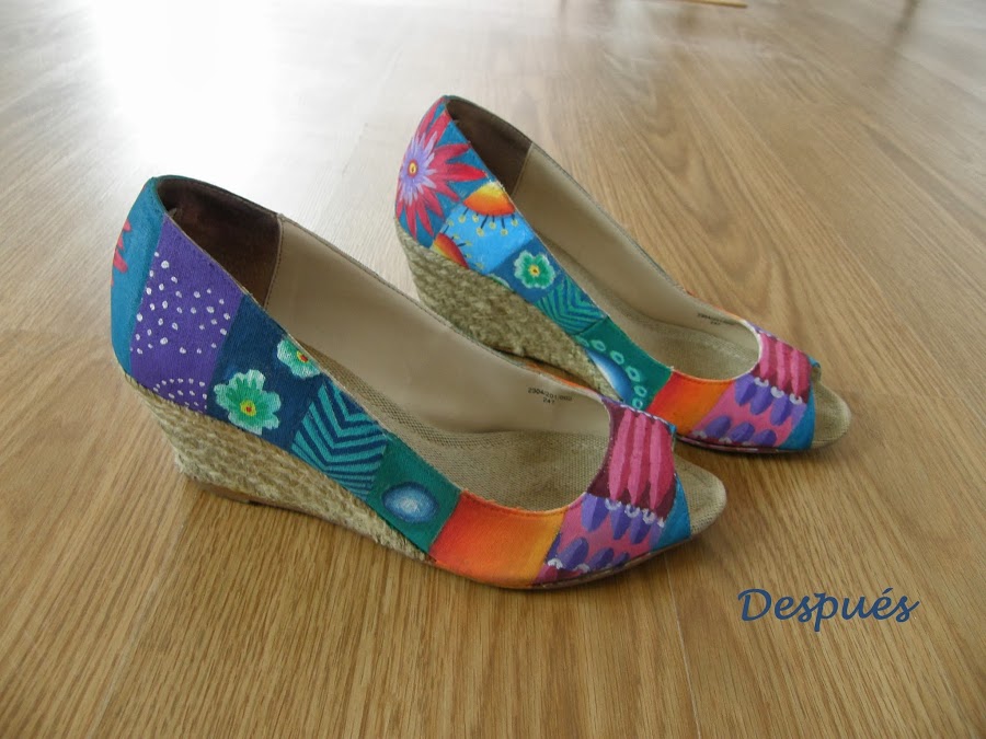 Sólo para las más atrevidas. Si en verano lucimos alpargatas de tela con alegres dibujos de colores, ¿por qué no en los zapatos? Desde que vi lo bonitos que le quedaron los manolos de Joly me quedé con ganas de probar (os recomiendo ver su vídeo). Tienen que ser zapatos de piel para que absorban la pintura y no se cuartee. Estos se habían quedado muy feos por el paso del tiempo y ya no había form ...