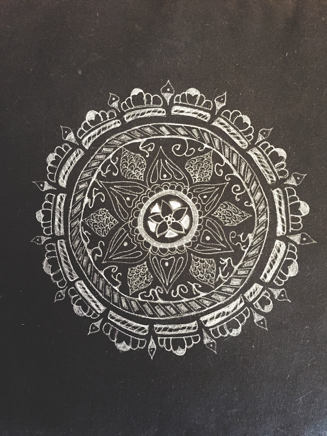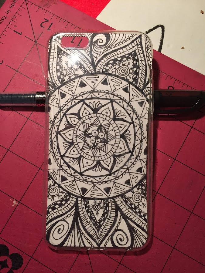 Pero como seguía teniendo el gusanillo de hacer más zentangle art sin tener ningún patrón ni ver ninguno por internet, decidí personalizar una carcasa para el móvil. Compré una funda transparente. En una cartulina, justo en el medio, empecé a hacer formas geométricas hacia afuera, en forma de círulo. Luego la recorté con la forma de la funda y listo.