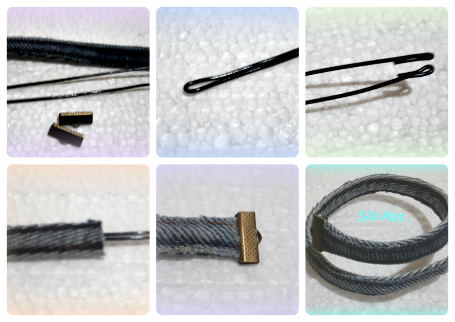 Doblamos el alambre por la mitad y las puntas las doblamos también , y lo hacemos pasar por el espacio entre pespuntes de la tira.