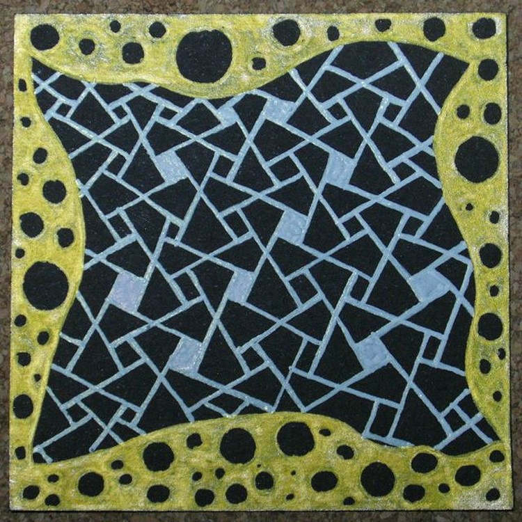 La fotografía no hace justicia al color dorado, no he logrado ajustar el brillo y luminosidad para que apareciera realmente como es.... oro viejo. Sobre negro los trazos lineales quedan muy opacos, me gustan, pero los rellenos grandes al secar no quedan homogéneos y transparentan ligeramente el fondo oscuro. La próxima vez que trabaje con rellenos en fondo oscuro probaré a dar una segunda capa cuando la primera haya secado.